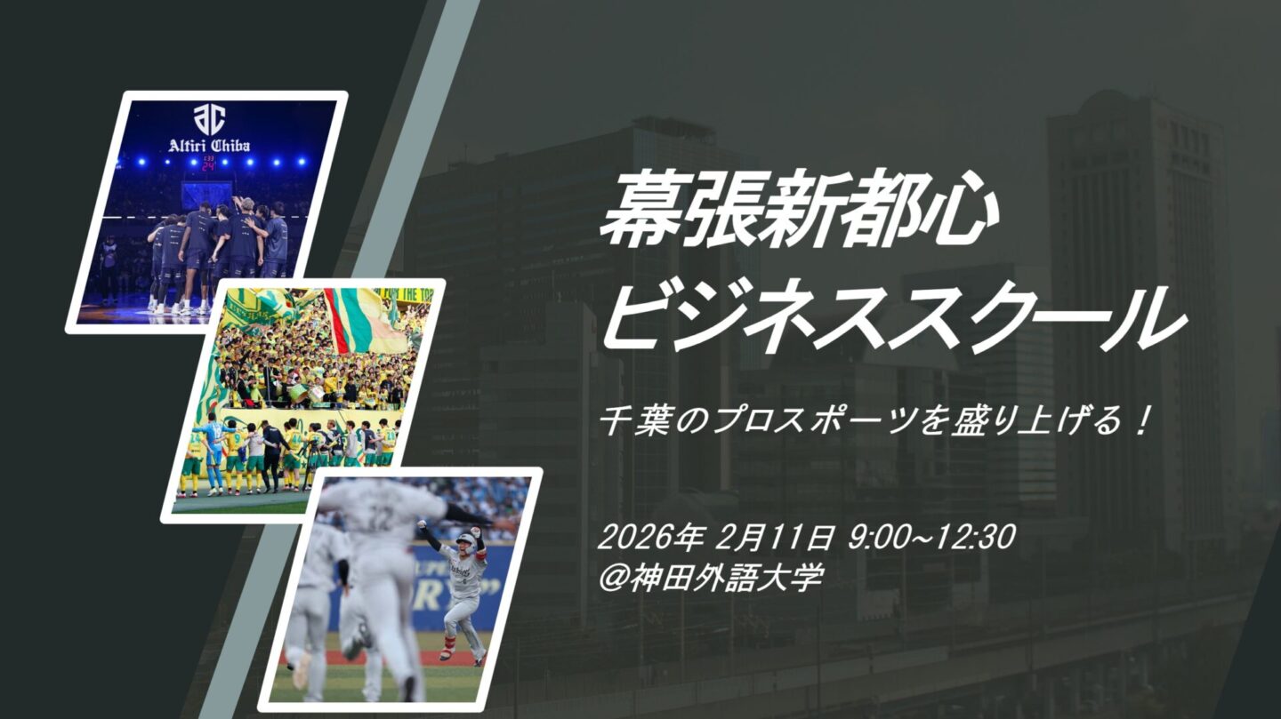 幕張新都心ビジネススクールを開催しました! 2026.02.11 イベント・活動 2026年2月11日、千葉県内の高校生を対象とした「幕張新都心ビジネススクール」が開催されました。 本イベントでは、千葉市に本拠地を置くプロスポーツチーム3団体(アルティーリ千葉、ジェフユナイテッド市原・千葉、千葉ロッテマリーンズ)を迎え、パネルディスカッションおよびワークショップが行われました。 弊研究室は、本イベントの企画・運営に携わりました。このような貴重な機会をいただきましたこと、関係者の皆さまに心より御礼申し上げます。 一覧へ戻る